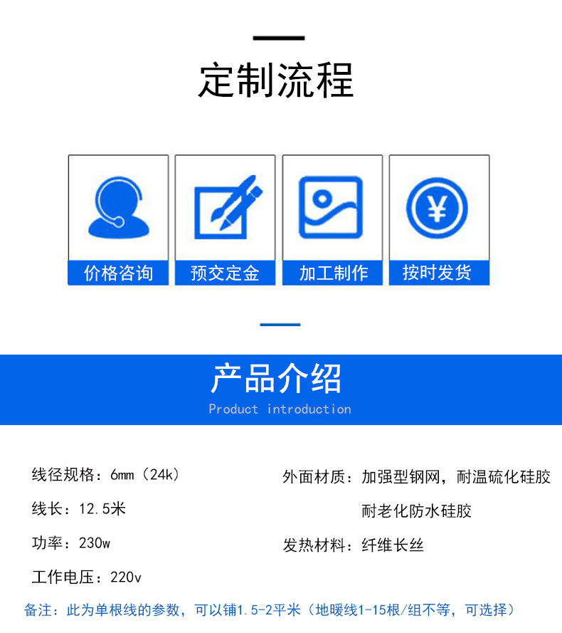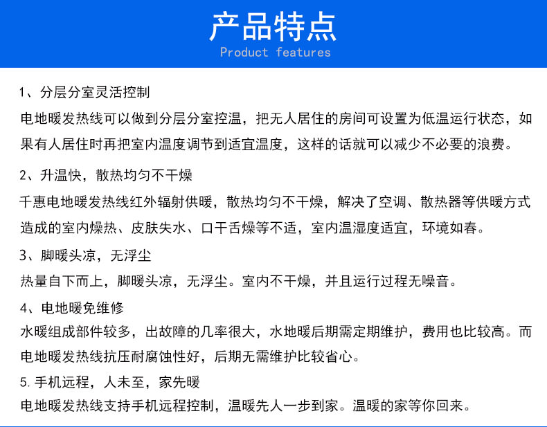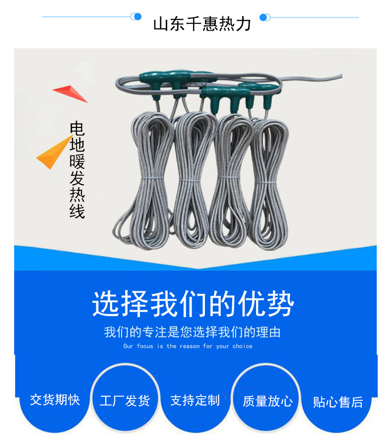 电地暖发热线以其通电升温快,铺装便捷,智能控温等优势被被广泛应用于:房间地面取暖,汗蒸房取暖,新建楼盘,旧房改造,移动板房,畜牧养殖,种植业等等。