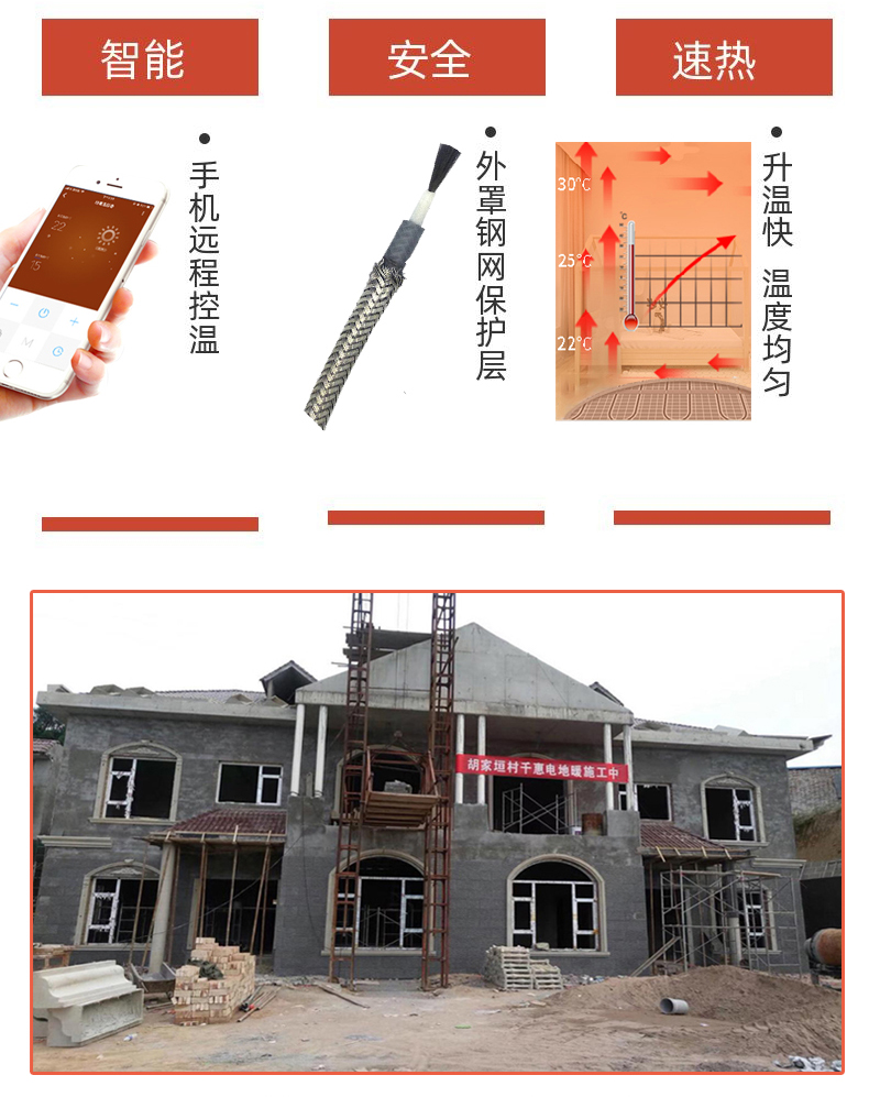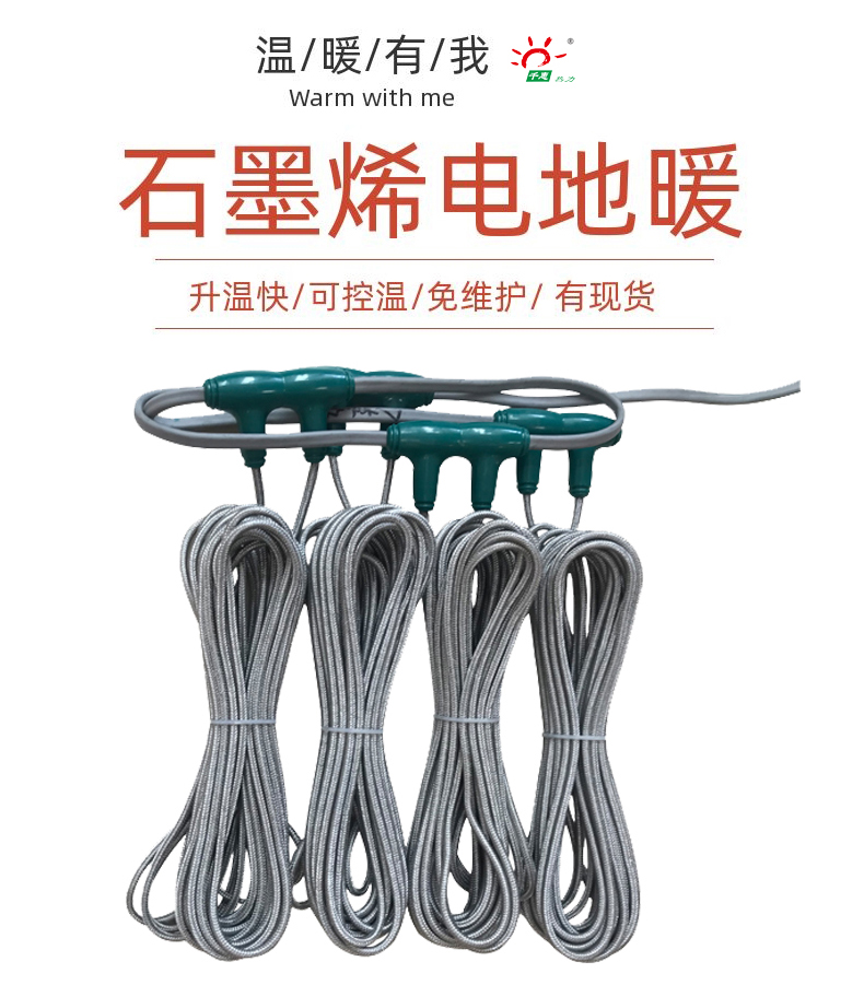 石墨烯电地暖发热线以其通电升温快,铺装便捷,智能控温等优势被被广泛应用于:房间地面取暖,汗蒸房取暖,新建楼盘,旧房改造,移动板房,畜牧养殖,种植业等等。