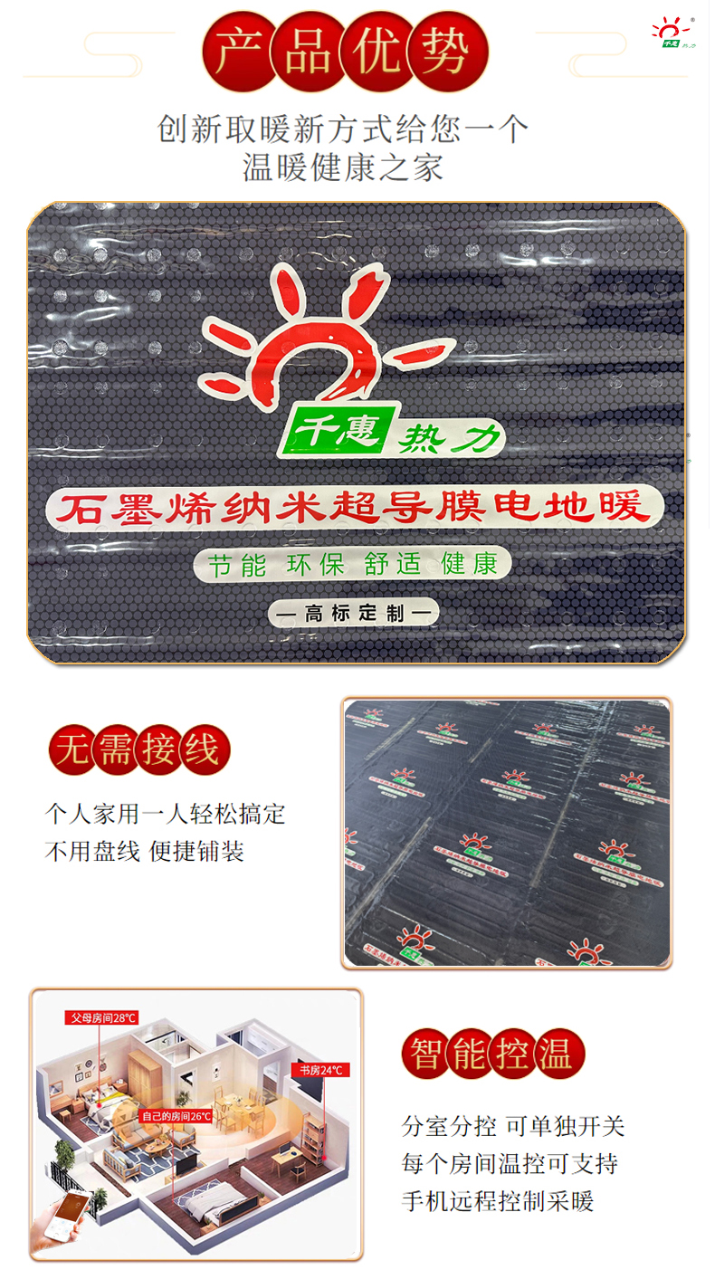 山东千惠热力科技有限公司2025年新品推出石墨烯超导膜电地暖,减少铺线工艺施工便捷,一人即可铺设。石墨烯超导膜通电升温快,智能控温,灵活采暖便捷。可根据采暖需求进行灵活性控温。